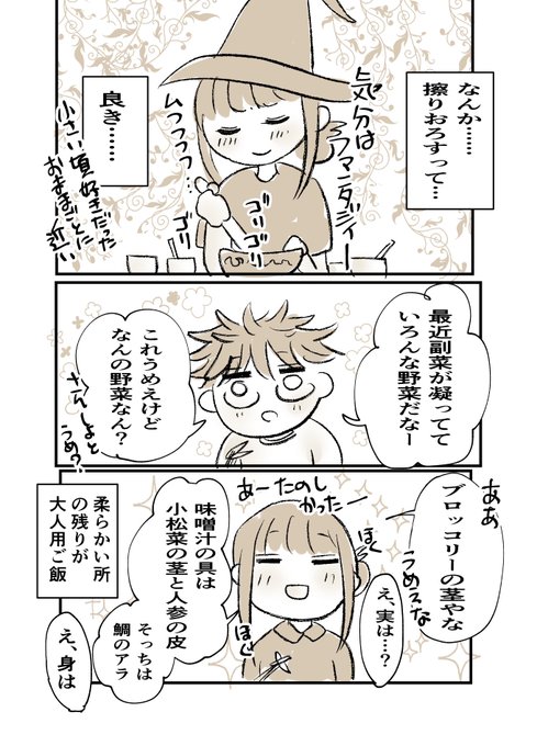 擦り潰す、擦りおろす、微塵切りが料理で一番楽しい工程なので、離乳食楽しい。最近擦り潰し成分が足りなくて、週一で麻婆豆腐(花椒擦り潰し)とかナッツ買ってきてゴリゴリしてからのピーナッツ和えやってます。おままごときぶん。 #育児漫画