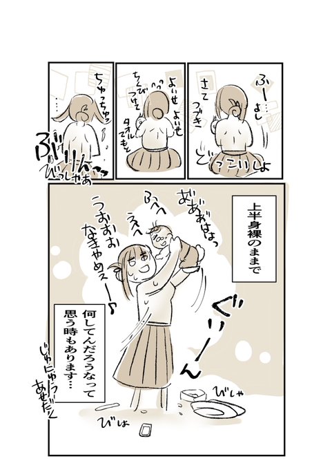 もうずっと半裸。遊び飲み激しい時は数秒で足りないーー!!って泣くのでいったん立ち上がって揺すったり抱っこして歩いたりして宥めつつ宥めつつ飲んでもらう。意外と外出先の方が緊張して大人しかったりするんだけど……。 #育児漫画