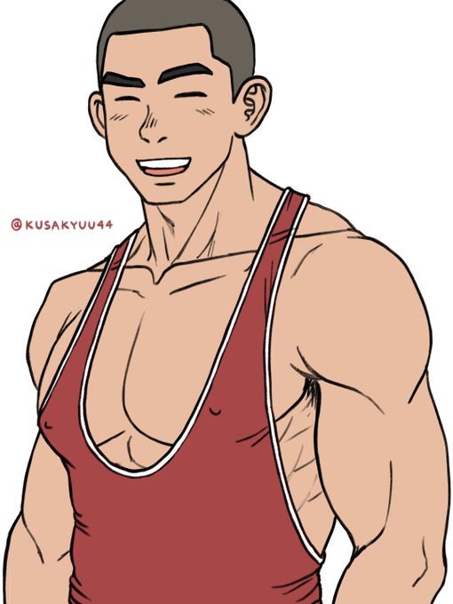 A wrestler guy who looks cute with a skinhead and naive smile. 💙❤️