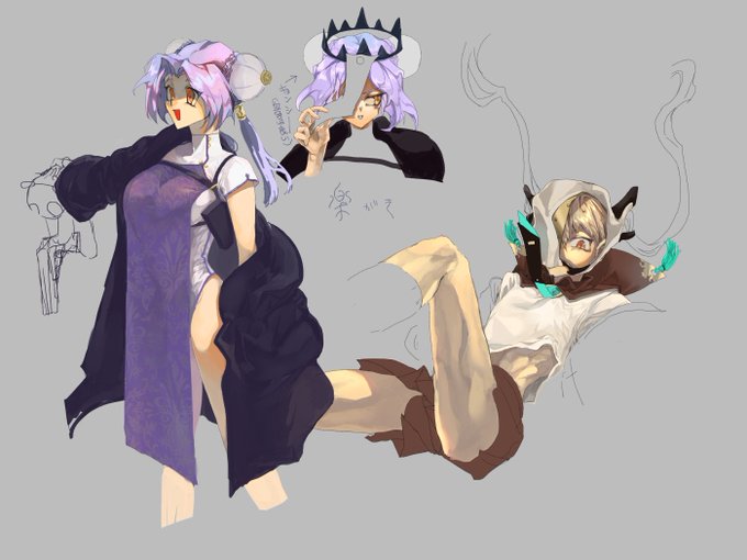 @pkgmousou スラム街みたいなチャイナタウンでお掃除屋さんとして働いてるキョンシーとのろわれボディ(女装)コンビ。ガラガラの顔に傷あるの忘れていた