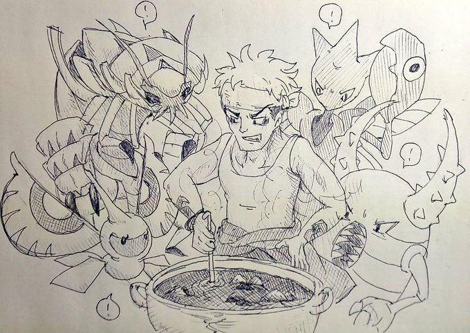 ガラル地方でグズマさんが虫たちにカレーを振る舞うやつです(タンクトップのグズマさんが見たかっただけのクソ落書きです) #ポケモン剣盾 #グソクムシャ難しすぎるだろ #カイロスさん見習って
