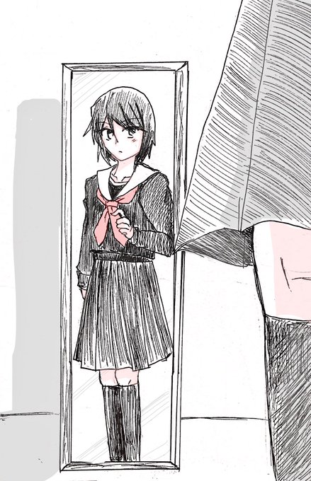 #オリキャラ版真剣お絵かき一発勝負 お題「制服」 これ以上下手に色を塗るのが怖かったのでここで終わっときます(震え声 初めてセーラー服に袖を通した、中学生の久遠涼夜 動画可
