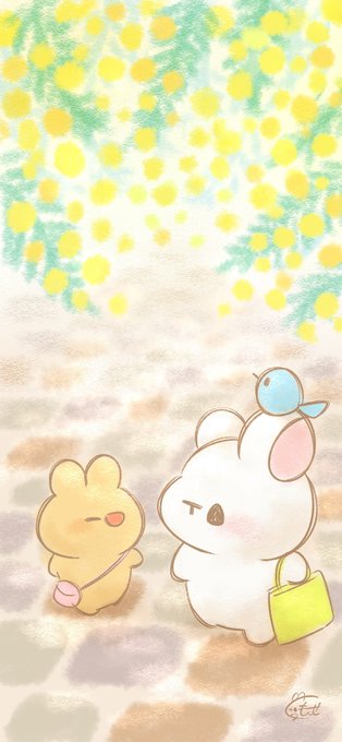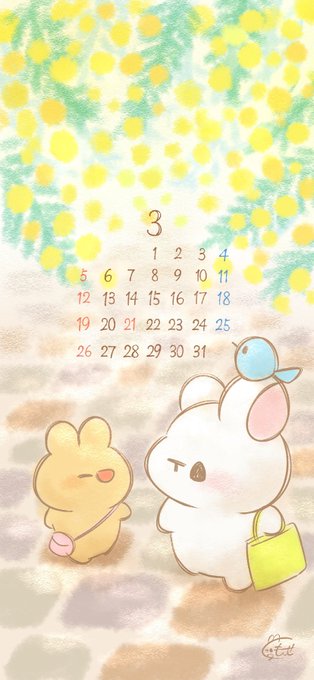 遅くなりましたが3月の壁紙&カレンダーです! ミモザの道を歩くうさぎ達。 良かったらお使いください😊 #3月 #カレンダー #壁紙 #ミモザ