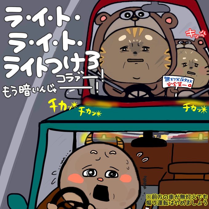 夕暮れ時は事故が多発しますがその理由のひとつに無灯火運転が挙げられます😢 ヘッドライトは他の車に自分の車の存在を示す為のライトでもあります 早めのライト点灯でお互いの事故防止に繋げよう🚘☺️ ※くまねこのような煽り運転はやめましょう👮♀️ #事故防止 #イラスト #無灯火運転 #漫画