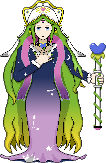 A #pixelart character I drew as my "OC". A motherly goddess figure with an emphasis on cool colors and an aesthetic of nature/sky. Image alt text provides names for the main inspirations.