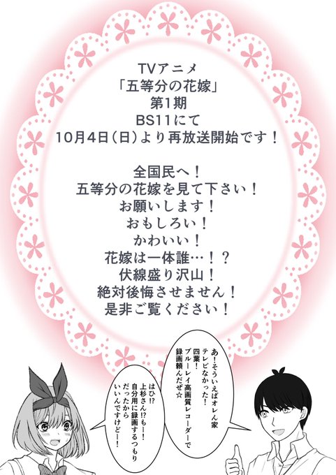 BS11で!10月4日(ついに明日!)より 毎週日曜よる11:30〜 五等分の花嫁の1期再放送が始まります!見て!!!! という、アニメ五等分の花嫁布教漫画です #五等分の花嫁