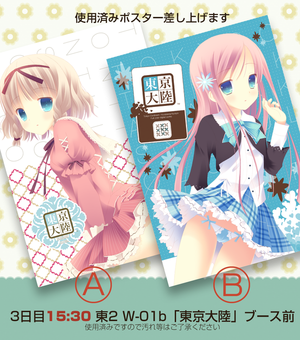 ちょっと古くて申し訳ないのですが、冬コミで使用済みのポスター差し上げます。 たまにリクエストを頂くので…。 3日目 W-01a ブース前 「3時30分」です。