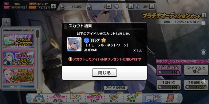 のあさんお迎え! まさかの天井で若干涙目ですけど新SSRとっても嬉しいです!素敵なのあさんをありがとうございます! 後程MV堪能します💕✨ プレミアムカットも欲しいなぁ~あとでフィルム交換しようかな! #デレステ 石スッカラカン…。また貯めなきゃ…。