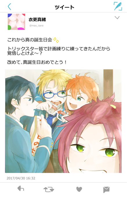 💙「衣更、たんじょ…💛「サリ〜おめでとう〜〜!!」 💚「あっずるい明星くん僕も僕も〜〜♪」 #衣更真緒生誕祭2017