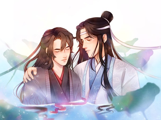 I love them so much i'm crying 😭Lan Wangji respectfully starring at bb wei wuxian ♥ also they're in water with lotuses for no reason... but they're having fun