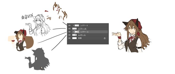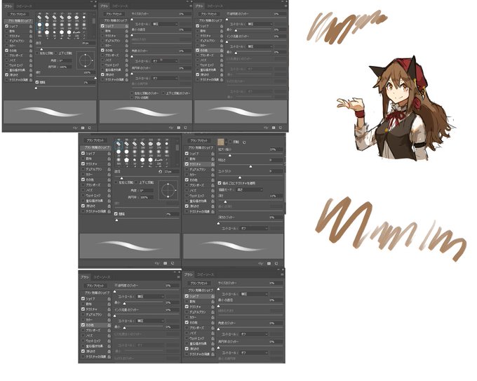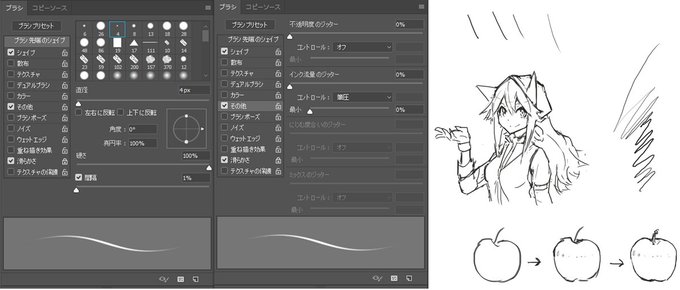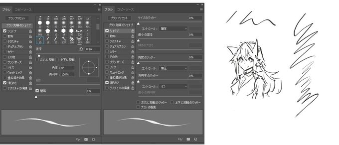 DMにてペン設定が見たいという方がいたので超ざっくり解説。 1:ラフ用。サイズ変更が面倒なので筆圧変化が激しい設定。 2:塗りも消しも線も大体これで描く。ラフを消して描いての繰り返しで整える 3:塗りわけ後のレイヤー構造 4:塗りむら欲しい時用。統合して影つけて描き込んで完成