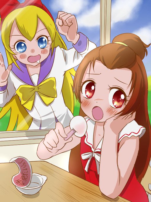 「シロクマサイズのジェラートとか、天気が変わるとか、モフルンをいたずらな犬にするとか、だいたいキュアフェリーチェの暴走です」キュアフェリーチェ、キュアミラクル、キュアマジカル、モフルンです #プリキュア版深夜の真剣お絵描き60分一本勝負