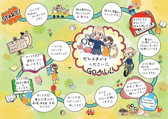 わみだちゃん@rose9artz にmakaniまにまにlaniのパンフレットをつくってもらいました。この頃、子どもたちとすごろくや人生ゲームをすることが多くてすごろく風にしてみたのです☺︎