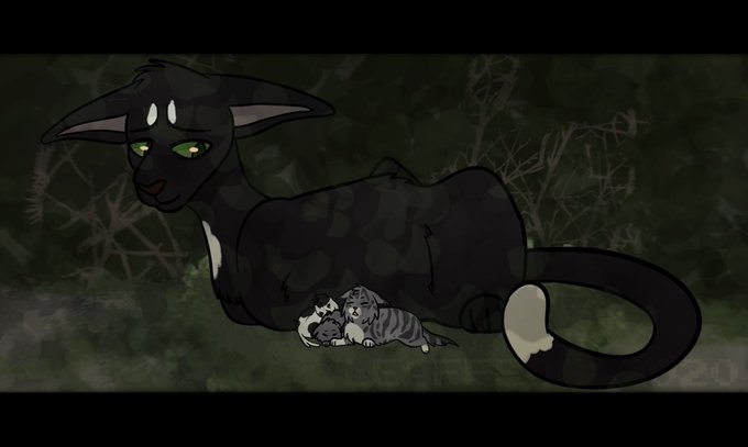 got a bunch of ocs of mine here but the star is wolfpaw— soon to be wolfstorm! also shown is her bad dad, snakethroat— her sisters pepperpaw and goosepaw, her mom beetletail & more!