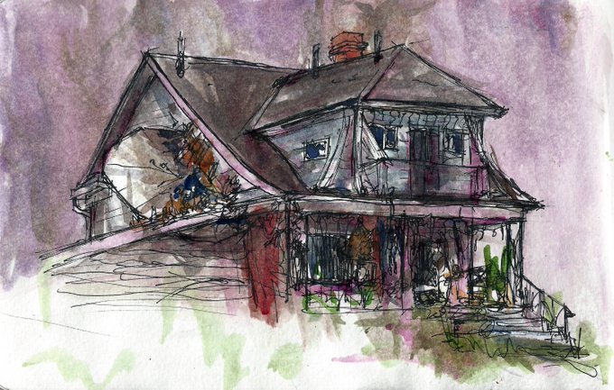 Here's an #urbansketch of a house in #medicinehat with one of the best Halloween decorations I've seen.