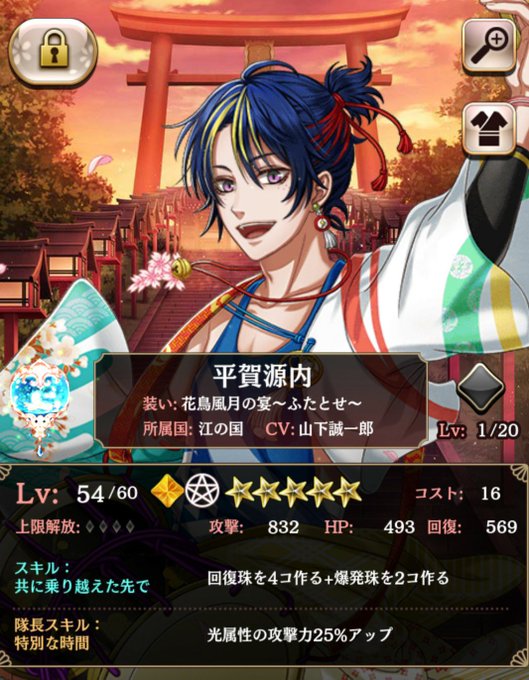 定期的に好きな男子を5人ピックアップして眺めて、無茶なガチャを防止しないとwヤタ、清盛、源内君、一君の4人は変わらずに大好きなんだよね。5人目に今は慶次入れてるけど、ここは流動的( *´艸`)