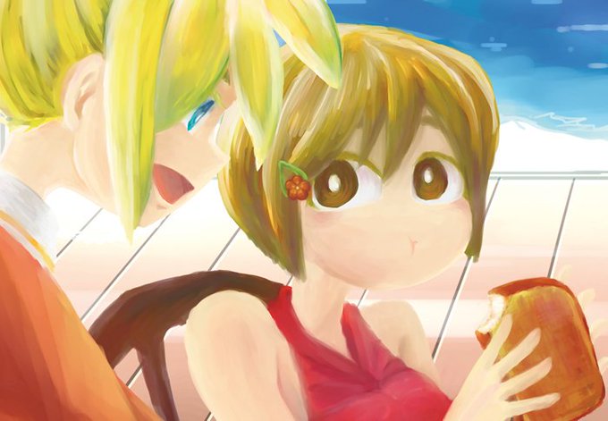 空穂様との合同作品でご寄稿いただきました。南の島でバカンス中!仲良くお揃いのハイビスカスをつけた二人が、とっても可愛い作品です!
