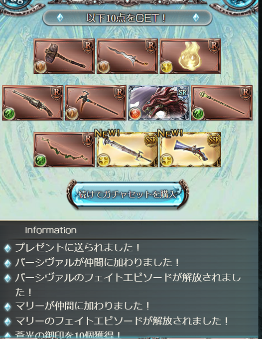 天井までの127連でSSR8個。計300連で丁度18個。 ちなみに300連でリミ武器は2本。ピンポイントで未所持キャラ引けたから運が良いな。あと4凸済みのベリアルがついに被った。