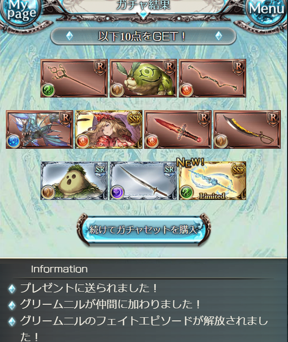 グラブル無料10連3日目。 フェスでもないのに虹二つでしかも未所持キャラ。虹3日連続だし反動が怖いな…。今夜プリコネでクリチカ天井コースの予感。