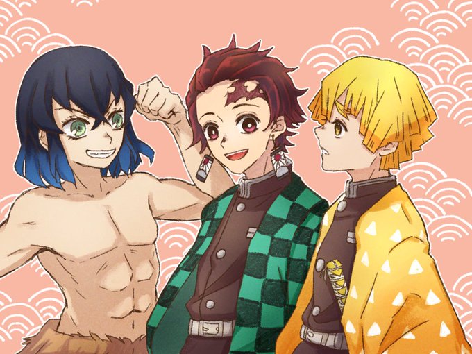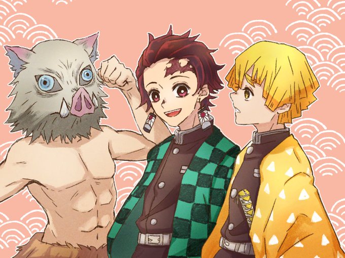 かまぼこ隊~! 伊之助の顔描きたいけど、三人でわいわいしてるときは猪頭だろ~~って葛藤の末、両方描いた