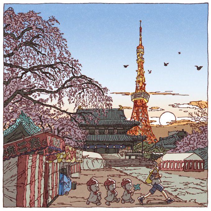 Le quartier de Kanda vu et dessiné par @wabisabipop Shinji Tsuchimochi ! Son tirage d'art du temple #Zojoji est encore disponible sur @ululeFR