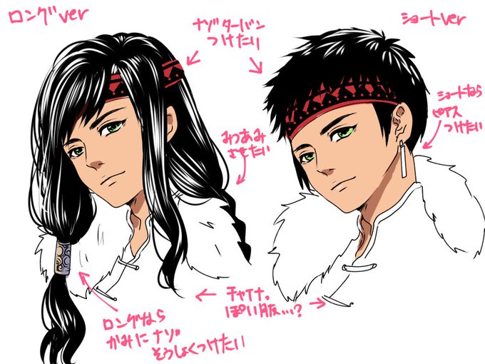 @kinugemouse まなさん案踏まえてこんな感じ!!謎ターバンを付けたかった!!!出会った頃はロンゲで、身分がわかるイベント(??)でまなさん案のショートヘアーになるのもいいなと思った!!! 私案のショートはキアヌさん寄りだけど、顔が甘くて違和感かな…??