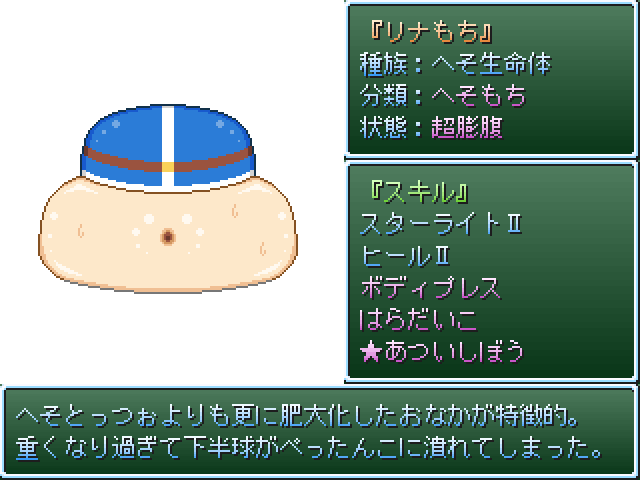 へそボールやへそとっつぉよりも更におなかが肥大化した結果、おなかの重さに耐えきれずに下半球がぺちゃんこに潰れて鏡餅のようなフォルムになってしまったパターン