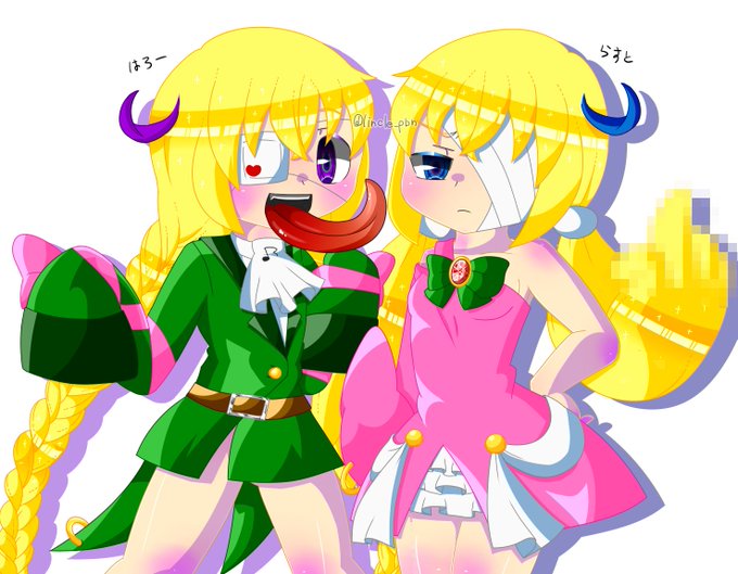 #同じキャラで初めて描いたのと最後に描いたのを比較 はろー(緑服の方)とらすと(ピンク服の方)