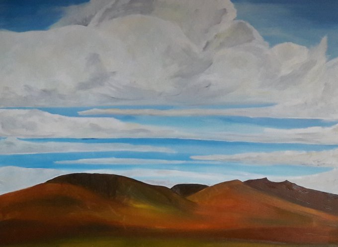 Tuesday 24th April @Penrithartclub are having their "Great Still Life Art Challenge"(my idea) I'm painting the backdrop to a Georgia O'Keeffe's still life painting. It's nowhere near perfect! But its a landscape😂 Luckly I'm not painting a Van Gough🌻 Cezanne or Claesz backdrop😂
