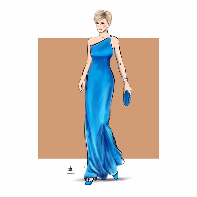 The beauty of #lessismorefashion worn by the amazing #queenofhearts #dianaspencer #ladydiana #dianaforever 💙💙💙 #princessdianaforever #dress satin blue #gown 1996 by #fashiondesigner #versace #versacemuse #gianniversace @versace ❤️#drawing by #dutchartist #lindazoon