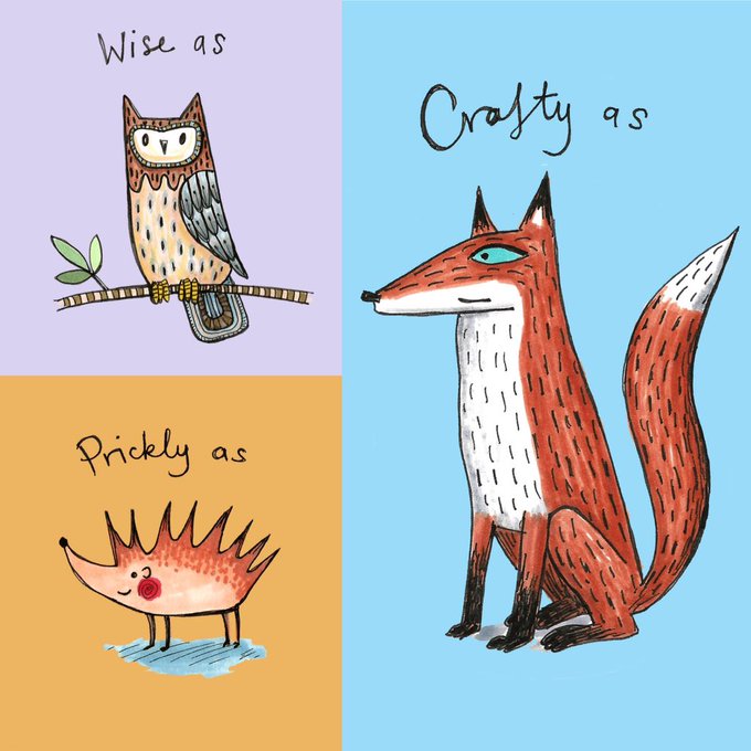 New designs for postcards. 2 more to come (busy as 'bee' and proud as 'peacock') and then off to printers. #CraftHour #postcards #owl #fox