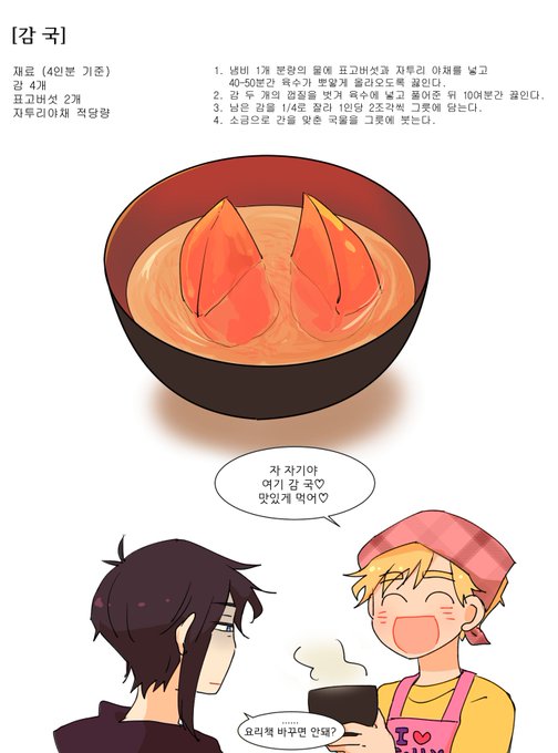 사쿠나히메의 감 국이 자꾸 생각나서 그려봤습니다... 레시피는 날조입니다 ㅋㅋㅋㅋ 그리다보니 왠지 단감으로 하면 먹을 수 있을 것도 같은데 제 머릿속에서는 늘 홍시였습니다
