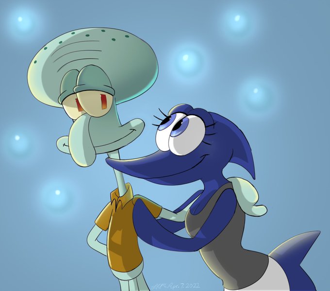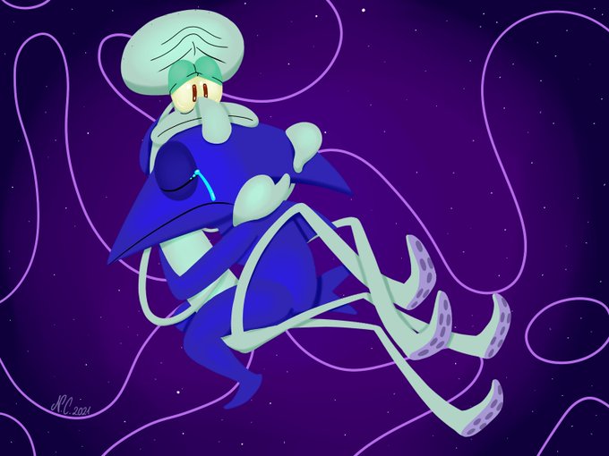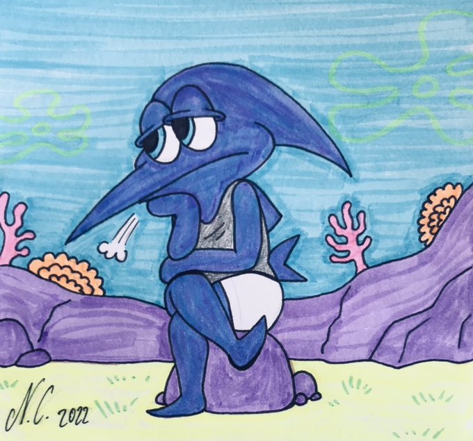 Was working on a #vent drawing featuring Squidward and my fancharacter/swordfish sona because I can't sleep.