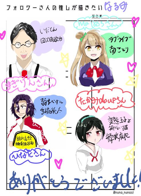 まぎりんさん(@magirin39Can ) maiめろさん(@maimelo_beat ) ひなたさん(@cham_0205hs ) たかみdoupさん(@doup24037446 ) 大変遅くなりました!描かせてもらいました!調べてから書きましたが、キャラ等が違ったらごめんなさい!笑って許してね!