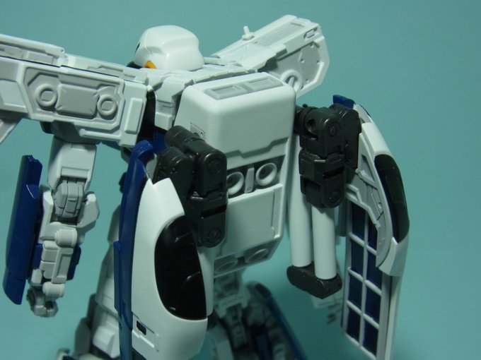 背面部。宇宙飛行士と言えば、といった典型的バックパック形状で作りました。990先頭車をそのまま使ったパネルは表面がデブリガード、裏面がソーラーパネルとなっており、アームで自在に位置を動かせます。