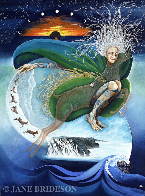 Balor of the Strong Blows (or Evil Eye) steals away the cow back to his island (Tory island?)! Cian seeks help from a druidess (& member of Tuatha De Danann), "Birog of the Mountain". She tells him that the cow can never be recovered while Balor is alive! ©@PJLynchArt @droimeann