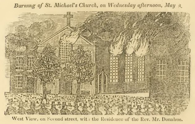 #Otd 1844: Philadelphia nativist riots contd. St Michael's Catholic Church & rectory, & St Augustine's Church burned by Irish Protestants. Didn't attack German Catholic church under construction! c 14 killed, c 50 injured, 200 fled homes. Damage equivalent $4.03 million in 2016!
