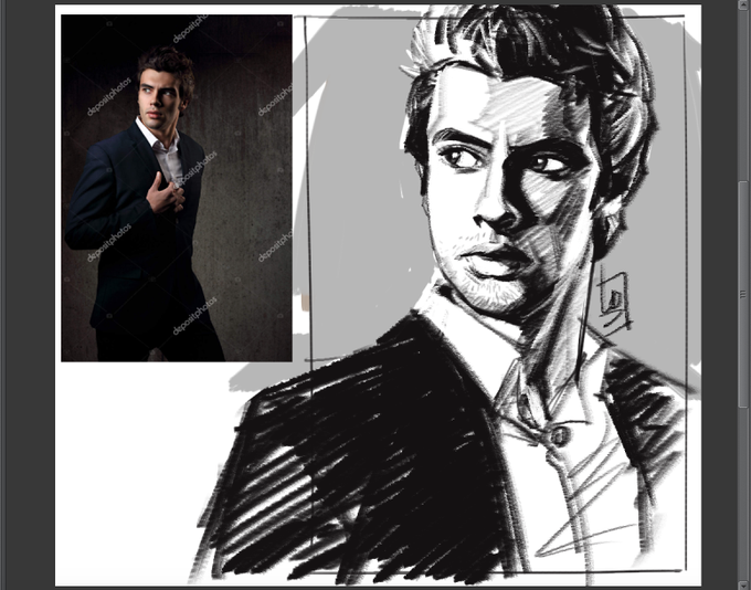 sketchy study of Sexy handsome male model posing in blue fashion suit and white style shirt on dark shadow background stock photo