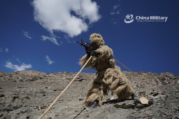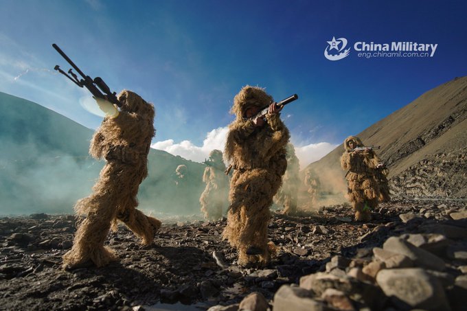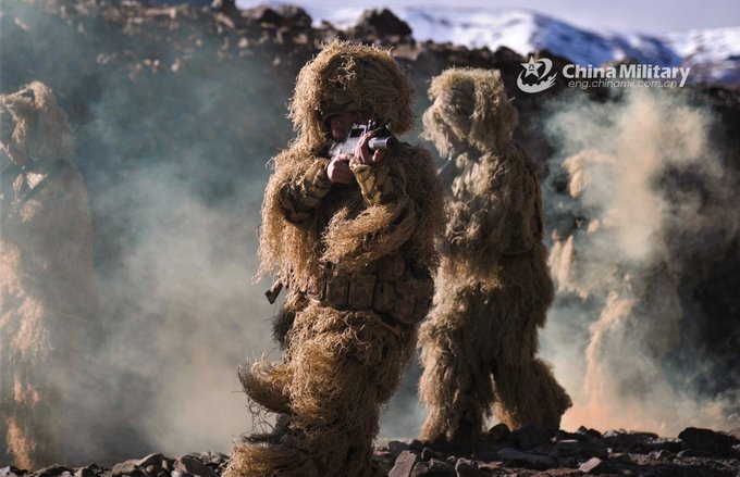 PLA soldiers assigned to a combined arms regiment under the Xinjiang Military Command climb the steep mountain in line during a reconnaissance tactical training exercise recently. 😎