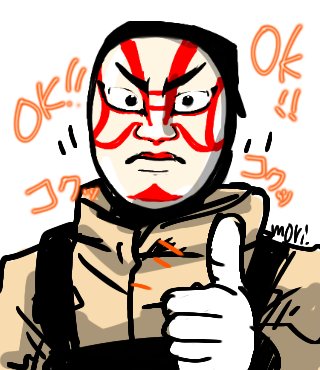 隈取さん忘れてた\(^-^)/ OK!! とりあえず何でも大丈夫だ!って 乗り気ってそうw #おめんず一言ガチャを描く