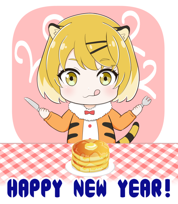 年賀イラストできました。時間なくてホットケーキはおもいっきり素材・・。 虎で連想したのがバターになるあの絵本だったので! 改めてあけましておめでとうございまーす!