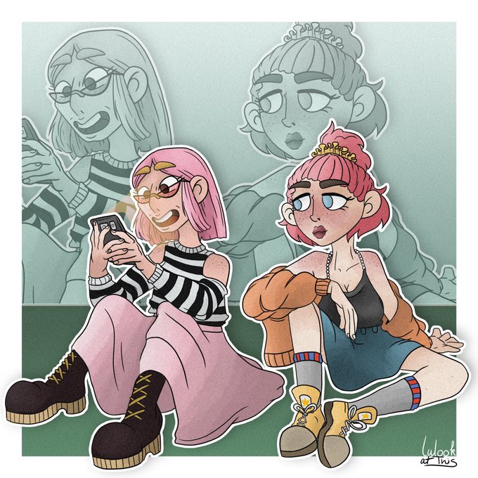 Only @Kirstie_1999 responded to my "Let me draw your OC" thingy, so now I drew both our pink haired girlies hanging out.