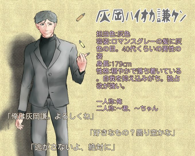 灰色担当の灰岡ハイオカ謙ケンです。他の色を引き立てられたらなと思っております。モブにでも背景にでも使ってやってください。宜しくお願いします:( 'н' ): #からーぱれっと #からぱれ_CS