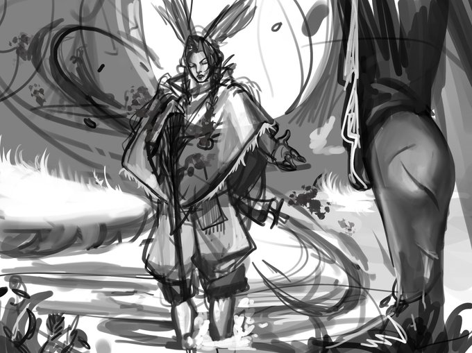 It ain’t done but I’ll post my progress so far, I ended up getting too into rendering the black and white one so I just had to trace over before painting it lol I don’t like to colorize after just mapping out values 🤡 #wip #workinprogress #painting #illustration #composition