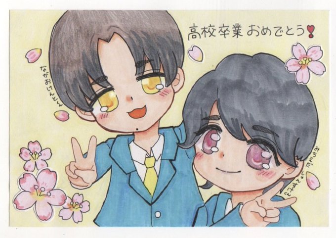 4月号のP誌にみちながちゃん高校卒業おめでとうイラストを掲載して頂きました✨ なにわ男子の最後の学生コンビの卒業は何としてもお祝いせねば!と思い描いたイラスト😊 桜がピンクみちえだくんカラーなので背景は謙杜くんカラーの黄色に💗💛 改めて高校卒業卒業おめでとう〜🌸