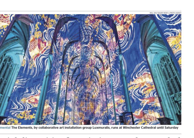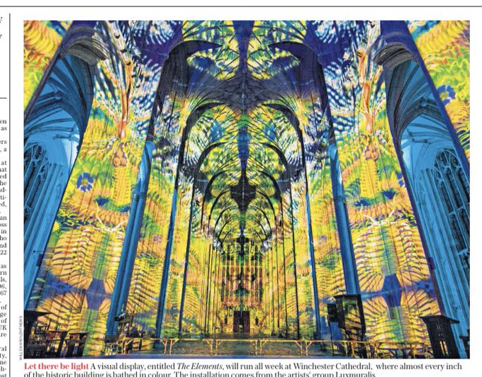 Great to see #theelements feature in the Times and Telegraph today as it premieres @WinCathedral until 11th March. Thanks to @snapagency. Fine art #sonetlumiere inside the #cathedral