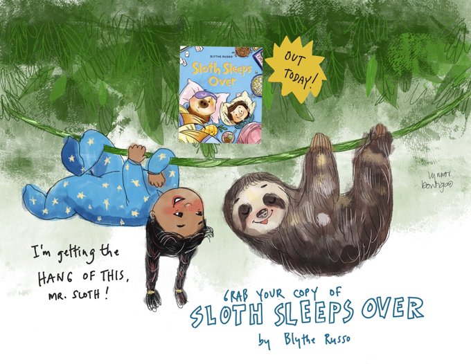 Congrats to kidlit friend, @blythe_russo Her PB is out today: SLOTH SLEEPS OVER. Join Blythe at 1PM on IG Live for a fun pajama party!