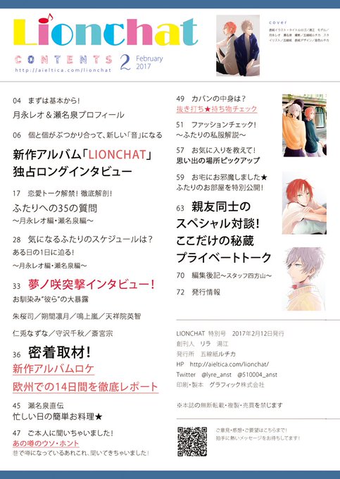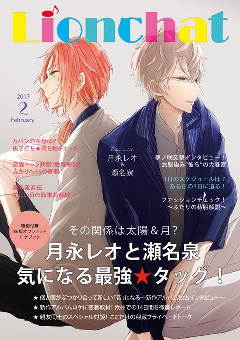 【宣伝】 2月ブリデ発行予定のレオいず雑誌風合同誌「LIONCHAT」の表紙ができたので、目次と本文内に入る予定の月永レオの雑誌風広告と一緒に紹介させて下さい!pixivのサンプルは後日…! よろしくお願いします~! 詳細:https://t.co/WOJcLtoM5M