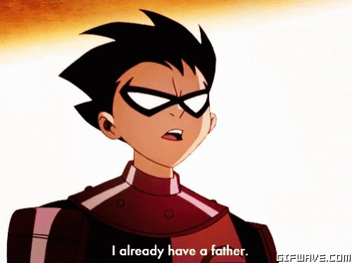 アニメ ティーンタイタンズのロビンは アニメ ザバットマンのロビンの数年後の姿なので ここで彼の言う「父親」ってのは あの若き日のブルース・ウェインなんですよね〜