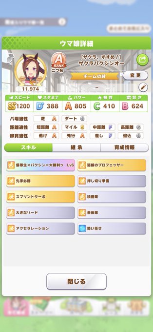 またもや冷や汗のクリア。 賢さ育成なのに賢さは乗らんし、チームは順調に育ってたのに決勝で負けるしでアカンと諦めてたけど、流石バクシンオー、レース数の多さでカバー。 これにて全科目優でクリア!